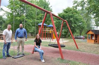 Sehr gelungen: Die Neugestaltung des Spielplatzes in Hoppachshof. Im Bild Bauhofleiter Rene Seith, Bürgermeister Johannes Grebner und Schülerpraktikantin Lara Hümpfner.