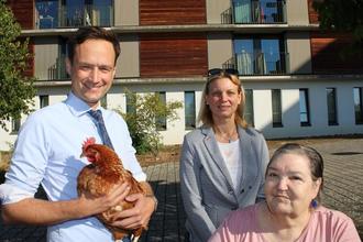 Huhn Agathe hat sich für das Foto mit Landrat Florian Töpper in Position gebracht. Mit auf dem Bild (von rechts): Charlotte Gruber, Bewohnerin des Kreisalten- und Pflegeheims Werneck, und Geschäftsführerin Simone Falkenstein
