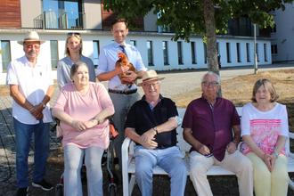Unterstützerinnen und Unterstützer des Hühnerprojektes (hinten, von links): Herbert Eichelmann, Geschäftsführerin Simone Falkenstein und Landrat Florian Töpper mit Huhn Agathe; vorne, von links: Bewohnerin Charlotte Gruber, Peter Vanselow, Helmut Stretz und Seniorenbeauftragte Stefanie Reith.