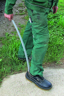 Ein langer Schuhlöffel erleichtert das Schlupfen in die Sicherheitsschuhe.