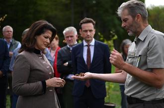 Stephan Thierfelder, Bereichsleiter Forsten am Amt für Ernährung, Landwirtschaft und Forsten Schweinfurt, zeigt Ministerin Michaela Kaniber im Wald bei Handthal die Folgen von Dürre und anhaltender Hitze anhand von Bucheckern, die keine Früchte ausgebildet haben.