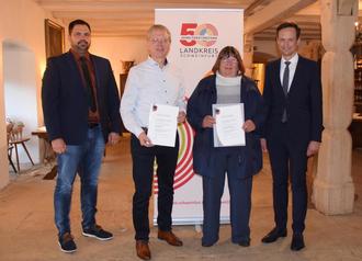 Im Bild von links: Bürgermeister Johannes Grebner, Stefan Mai, Theresia Rudolph, Landrat Florian Töpper