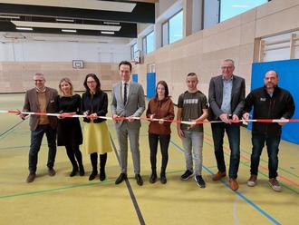 Sie gaben am 9. Februar 2023 symbolisch gemeinsam die generalsanierte Turnhalle des Beruflichen Schulzentrums (BSZ) Alfons Goppel zur Nutzung frei (von links): Frank Hart (Leiter des Hochbauamts am Landratsamt Schweinfurt), Regierungsdirektorin Nadine Bock (Regierung von Unterfranken), Architektin Susanne Baur (Planungsbüro B&O Concept), Landrat Florian Töpper, Celina Nitsch (Schülersprecherin am BSZ), Konstantinos Evangelos Angeletakis (Berufsintegrationsklasse am BSZ), Schulleiter Joachim Sagstetter und Bauleiter Stefan Röder (B&O Concept).