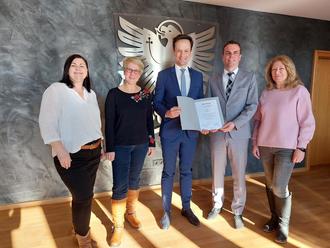 Im Bild: Landrat Florian Töpper (3. von links) und Jugendpflegerin Bettina Stampf (2. von links) überreichten Bürgermeister Oliver Schulze (4. von links) im Rathaus das Zertifikat, im Beisein von Sabrina Röder (links, Gemeindejugendpflegerin) und Elke Klehe (rechts, Rektorin der Grund- und Mittelschule Sennfeld).
