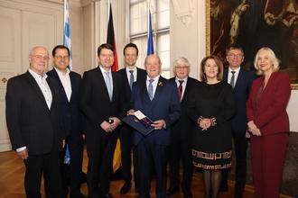 von links: Gerhard Hefner, Frank Hefner (stellv. Vorstandsvorsitzender VR-Bank Main Rhön), Innenstaatssekretär Sandro Kirchner, Landrat Florian Töpper, Geehrter Paul Kolb, Friedhelm Brusniak (Präsident Fränkischer Sängerbund), Landtagsabgeordnete Martina Gießübel, Bürgermeister Ulrich Werner und Regierungspräsidentin Dr. Susanne Weizendörfer.