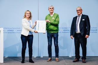 Im Bild: Bundesumweltministerin Steffi Lemke überreicht Thomas Vizl, stellvertretender Landrat des Landkreises Schweinfurt, die Urkunde für den Papieratlas-Landkreiswettbewerb 2022. Rechts: Ulrich Feuersinger, Sprecher der Initiative Pro Recyclingpapier.
