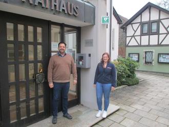 1. Bürgermeister Johannes Grebner und Christine Ilauski bei der Übergabe des Defibrillators vor dem Rathaus in Hesselbach
