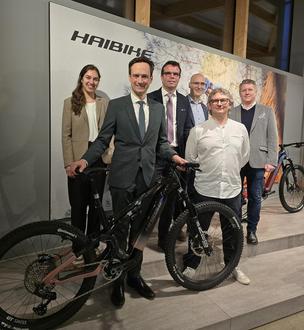 von links: Rebecca Weber (Wirtschaftsförderung Landkreis Schweinfurt), Landrat Florian Töpper, Bürgermeister Oliver Schulze, Frank Deubner (Leiter Wirtschaftsförderung Landkreis Schweinfurt), Robert Wagner (Geschäftsführer WINORA, E. Wiener Bike Parts, GHOST-Bikes) und Alexander Beck (Finance Director WINORA, E. Wiener Bike Parts, GHOST-Bikes)