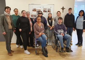 Im Bild: Schülerinnen und Schüler der 10. Klasse der Frieden-Mittelschule Schweinfurt nutzten das Projektangebot „Pflege on Tour“, um interessante Einblicke in den Pflegeberuf zu erhalten. Sie waren hierfür gemeinsam mit ihrer Lehrerin Verena Ludwig (hinten, Dritte von rechts) einen Vormittag zu Gast im Wilhelm-Löhe-Haus in Schweinfurt. Hinten (Mitte) ist eine Schülerin zu sehen, die den sogenannten Alterssimulator ausprobiert: Mit Hilfe von Gewichten, einer Spezialbrille und einem Gehörschutz wird simuliert, wie sich Personen mit körperlichen Einschränkungen fühlen. Einrichtungsleiterin Renate Aman (rechts) und weitere Fachkräfte der Einrichtung ließen die Schülerinnen und Schüler an ihrem beruflichen Alltag teilhaben. Organisiert wird das Projekt von plus Anja Lehmeyer (links), Geschäftsstellenleiterin der Gesundheitsregion Stadt und Landkreis Schweinfurt.