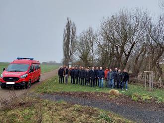 Im Bild: Mitarbeitende der Verwaltungen, lokale Akteure sowie Landrat Florian Töpper und Bürgermeister Thomas Heinrichs (vorne, Mitte, von links) freuen sich über den gelungenen Auftakt des Gemeindedialogs in Lülsfeld; im Hintergrund der Häckselplatz, dessen Nutzung eines der Themen auf der Tagesordnung war.