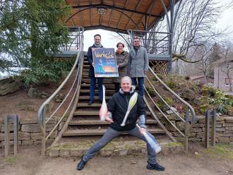 Im Bild: Dirk Denzer (vorne) ist der Organisator des Varietéfestivals, unterstützt wird er unter anderem durch den Landkreis Schweinfurt und die Gemeinde Sennfeld, hier vertreten durch (hinten, von links) Landrat Florian Töpper, Eva Krümpel (Kulturförderung Landkreis) und Bürgermeister Oliver Schulze.