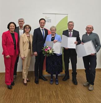 von links: stellv. Landrätin Christine Bender, stellv. Landrat Thomas Vizl, stellv. Landrätin Bettina Bärmann, Landrat Florian Töpper und die Geehrten Claudia Cebulla, Georg Wagner und Werner Steinruck.