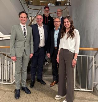 KI-Talk des Landkreises Schweinfurt mit (hinten, von links) KI-Experte Michael Aechtler und Wirtschafsförderer Frank Deubner sowie (vorne, von links) Landrat Florian Töpper, Ludwig Paul (Handwerkskammer für Unterfranken), Jürgen Bode (IHK Würzburg-Schweinfurt) und Rebecca Weber (Wirtschaftsförderung Landkreis Schweinfurt).