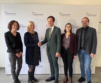 Vertrauensvoller, zwischenbehördlicher Austausch im Landratsamt mit (von links) Sonja Weidinger (Abteilungsleiterin Öffentliche Sicherheit und Ordnung), Regierungspräsidentin Dr. Susanne Weizendörfer, Landrat Florian Töpper, Zoe Beckmann (Abteilungsleiterin Soziales und Gesundheit) und Christian Frank (Abteilungsleiter Zentrales)
