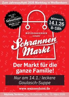 Auch im kommenden Jahr gibt es wieder in jedem Monat die beliebten Schrannenmärkte. In jedem Monat gibt es einen Termin und die historische Schranne in der Altstadt von Weißenhorn öffnet ihre Tore für einen Markttag - fast wie früher. Bis zu 12 Aussteller aus Weißenhorn und Umgebung präsentieren sich mit ihren Produkten. Oft gibt es noch kleine Überraschungen, wie ein spezielles Programm für Kinder oder eine Kleinigkeit für hungrige Mägen. Die Termine der jeweiligen Markttage (siehe auch die Terminübersicht für 2026) stehen im Stadtanzeiger und sind auch auf der Homepage der Stadt Weißenhorn nachzulesen. Dort gibt es auch weitere Informationen zu den Wochenmärkten an Donnerstagen und Samstagen, den viermal jährlich stattfindenden Krämermärkten und dem beliebten Nikolausmarkt.