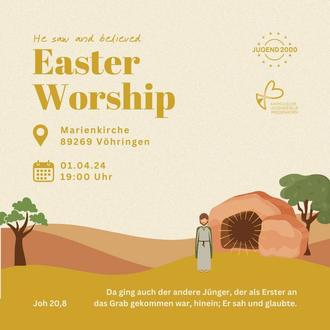 Herzliche Einladung zum Easter Worship am Ostermontag in Vöhringen. Erlebe eine besondere Zeit der Anbetung mit Lobpreis, Stille und Impulsen. Be welcome! Diese Oster-Holy Hour ist eine gemeinschaftliche Veranstaltung der Katholischen Jugendstelle Weißenhorn, der Jugend 2000 und der Pfarreiengemeinschaft Vöhringen.