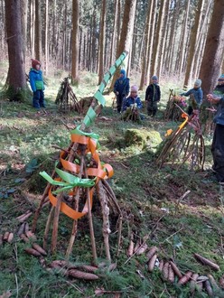 23 Waldwichtel, aus dem Waldkindergarten St. Franziskus, bereiteten sich mit diesem tollen Bilderbuch auf das bevorstehende Osterfest mit allen Sinnen vor. Wir hörten und sahen „Der Ostermond“ als Bilderbuch und oft als Tischtheater, wir sangen fröhlich Frühlings- und Osterlieder, spielten Klatschspiele „Jetzt beginnt die Osterzeit, alle Hasen sind bereit“, bastelten und malten Hasen und Hühner, bemalten Ostereier, falteten Osterfangbecher, genossen eine frühlingshafte Klangschalenmeditation, lauschten biblischen Geschichten von Jesus, erlebten mehrere Kett -Einheiten zum Frühling und bauten nun auch noch am Sonnenplatz viele tolle, sehr kreative Osternester. Jetzt kann es bei den kleinen und großen Waldwichteln Ostern werden und wir freuen uns auf die gefüllten Nester und wünschen allen Familien frohe Ostern und erholsame Ferien.