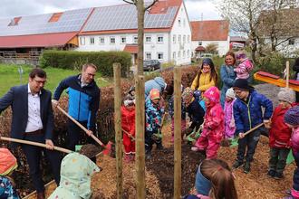 Bürgermeister Markus Wöhrle, Kindergartenleiterin Mandy Petzke und viele Eltern waren mit dabei. Hintergrund für die Pflanzaktion war der „Tag des Baumes“, der offiziell am 25. April begangen wird. Der Landkreis Neu-Ulm beteiligt sich seit 1978 am „Tag des Baumes“, um die ökologische Bedeutung der Bäume in den Mittelpunkt des öffentlichen Interesses zu stellen. Mittlerweile hat der Landkreis damit bereits 220 Bäume gespendet.