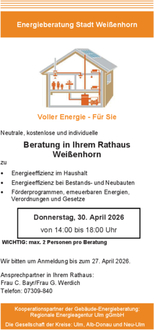 Die Stadt Weißenhorn bietet als Ergänzung zur Bürgerinformation der kommunalen Wärmeplanung für Ihre Bürgerinnen und Bürger erneut eine monatliche Beratung durch die „Regionale Energieagentur Ulm“ an.