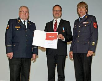 Ehrennadel des Kreisfeuerwehrverbandes (KFV) in Silber für 12 Jahre als Kommandant: Heinz Braun (Hittistetten), Franz Münzenrieder (Betlinshausen), Andreas Vogel (Nordholz).