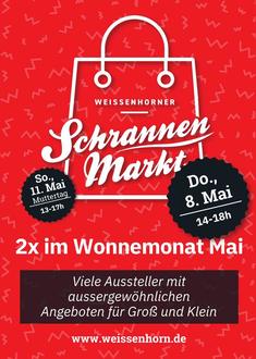 Im historischen Umfeld präsentieren sich im Mai - wie in jedem Monat - bis zu 12 Händler und Kunsthandwerker aus der Region. Die Besucherinnen und Besucher finden in der historischen Schranne in der Weißenhorner Altstadt Geschenkideen, Schönes und Nützliches - und beleben durch ihren Besuch die Altstadt von Weißenhorn. Am Muttertag, 11. Mai, öffnen sich dann zwischen 13 und 17 Uhr die Türen vieler Geschäfte und der Weißenhorner Gewerbeverband lädt ein zum 'Verkaufsoffenen Sonntag'. Die Schranne öffnet ihre Türen, auch als Raststation und Sanitäranlage. Außerdem erwarten die BesucherInnen ein Streetfood-Markt mit internationalen Spezialitäten, der beliebte Töpfer- und Kunsthandwerkermarkt, ein Antik- und Trödelmarkt und in der ganzen Innenstadt viele Attraktionen für die ganze Familie.