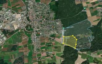 Der gelb gekennzeichnete Wald nördlich der Roggenburger Straße könnte für eine neue Bestattungsform ein Schritt in die Zukunft bedeuten. Diese Fläche des Fuggerschen Waldes würde über das Konzept der „Waldruh“ entwickelt und könnte die Bestattungslandschaft in Weißenhorn wesentlich bereichern.