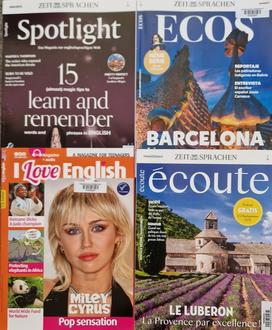 Wir haben für Bücherei-Mitglieder außer Buch-Lehrgängen auch vier Zeitschriften zum Fremdsprachen-Üben abonniert, und zwar in Spanisch (Ecos), Französisch (Ecoute) und Englisch (Spotlight), letztere auch für Teens (I love English). Die Zeitschriften für Erwachsene finden Sie auch in unserer Onleihe Schwaben, hier zusätzlich noch die italienische Ausgabe „Adesso“. In der Onleihe können Sie auch ELearning-Medien für ein halbes Jahr entleihen: es erwarten Sie über 14.000 Sprachkurse, neben Englisch, Französisch und Spanisch auch für Italienisch, Portugiesisch, Japanisch und Chinesisch. Greifen Sie zu – es kostet ja nichts!