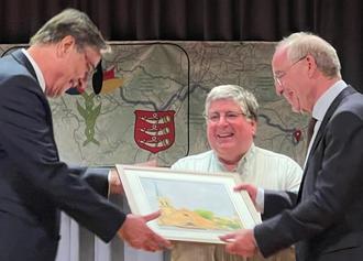 Bürgermeister Farcy überreicht Bürgermeister Dr.Fendt als Gastgeschenk ein kunstvolles Gemälde der Kirche von Villecresnes.