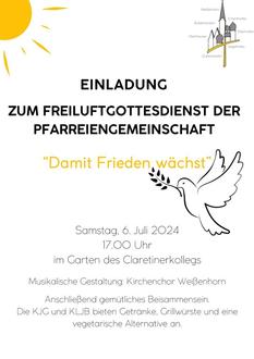 • zum Pfarreiengemeinschafts-Gottesdienst am Samstag, 6. Juli 2024 um 17.00 Uhr im Garten des Claretinerkollegs für alle Gemeindemitglieder unserer PG.