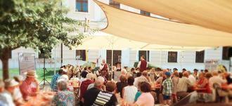 Jeweils am Sonntagvormittag, ab 11 Uhr musizieren die Musikkapellen aus der Gemeinde Roggenburg vor der besonderen Kulisse des Klosterhofes. Sie sind herzlich zu einer Stunde fröhlicher Unterhaltung eingeladen.