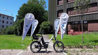 E-Bike des Landratsamts vor den Beachflags zum STADTRADELN.