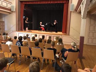 Auch der Dienstag, 11.07., stand für die ersten und zweiten Klassen der Grundschulen Weißenhorn-Nord und Weißenhorn-Süd ganz im Zeichen der Musik. Beim Kinderkonzert der Musikschule in der Stadthalle durften wir gemeinsam mit Wolfgang Amadeus Maus unsere Liebe für klassische Musik entdecken. Liebevoll und spannend in die Geschichte von der kleinen Maus, die das Singen lernte, verpackt, stellten uns Frau Kempfle, Frau Sagawa und Frau Sukale einige klassische Musikstücke vor und zeigten, dass Musik verbindet. Besonders schön für uns war, dass wir selber aktiv werden konnten und bei einem immer wiederkehrenden Lied zu einer Melodie aus „Die Zauberflöte“ von W. A. Mozart mitsingen durften.