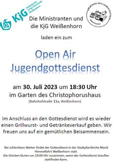 | • | zum Open-Air-Jugendgottesdienst der KJG und der Ministranten am Sonntag, 30. Juli um 18.30 Uhr – bei schönem Wetter im Garten des Christophorushauses. |