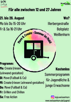 Das Jugendmobil ist im Einsatz! In der 4. Sommerferienwoche ist das Jugendmobil an der Illerbergerstraße beim Bolzplatz in Weißenhorn. Von Montag bis Samstag ist das Mobil für alle Jugendliche und junge Erwachsene geöffnet. Das Angebot ist für jede:n kostenlos und unverbindlich.