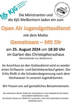 | Mariä H. | 18:30 | Freiluft-Jugendgottesdienst der KJG und Minis im Garten des Christophorushauses |