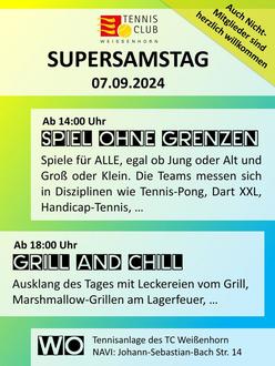 Unser SuperSamstag steht wieder vor der Tür! Natürlich sind nicht nur unsere Mitglieder, deren Familien, Freunde und Bekannte, sondern auch Nichtmitglieder herzlich eingeladen, mit uns einen tollen Tag zu verbringen. Wir starten um 14 Uhr mit unseren „Spiele ohne Grenzen“. Jeder kann mitmachen und Spaß ist garantiert bei „Tennis-Pong XXL, Tennis Dart XXL, Handicap Tennis etc., kommen bestimmt alle auf ihre Kosten.