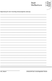 Vorschläge für Preisträger können mit dem in diesem Stadtanzeiger abgedruckten Vorschlagsformular bei der Stadtverwaltung bei Frau Maja Busse, bis spätestens 26. September 2025 eingereicht werden (Formular siehe Rückseite).