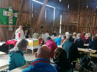 Der Gottesdienst im Stadel der Familie Gutter in Meßhofen, den die Weißenhorner Pax Christi Gruppe vorbereitet hatte, stellte die Suche nach Frieden in den Mittelpunkt. Gemeinsam dachte man über die Grundlagen des Friedens nach und baute daraus ein „Haus des Friedens“. Matthias van Velsen und Winfried Bader sorgten mit ihrer Musik für die richtige Stimmung. In seiner Predigt verband Stadtpfarrer Lothar Hartmann die Situation damals am Ende des Krieges mit dem Unfrieden heute: Mitten in Europa ist wieder Krieg und sind Menschen auf der Flucht. In einer solchen Situation sind gerade auch Christen gefragt, denn der christliche Glaube ist nicht unpolitisch, sondern mischt sich ein. Es geht um das Leben – nicht nur um unser eigenes, sondern auch das unserer Kinder, Enkel und der zukünftigen Generationen – Christen treten ein für eine zukunftsfähige Gesellschaft, die endlich aussteigt aus einer Kultur der Zerstörung der eigenen Lebensgrundlagen. In alter Pilgertradition gab es nach dem Ende des Gottesdienstes eine Pilgerbrotzeit. Dabei wurde erneut ein Arbeitskreis der Weißenhorner Kirchen und der Stadt sowie der Stadtgesellschaft angeregt, um die traditionelle Dankwallfahrt und den daraus resultierenden Auftrag – Weißenhorn soll Friedensstadt werden - in die Zukunft zu führen.