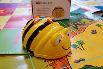 Danach, in den Pausen, dürft ihr mit unseren Bodenrobotern BEE-BOTS spielen. Wir haben extra Spielmatten, auf denen ihr mit den kleinen Bienen Aufgaben lösen könnt oder einfach nur nach Lust und Laune rumfahren.