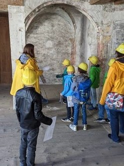 Neun Entdecker-Kinder sind am Weltkindertag mit uns auf Tour gegangen, um hüpfend, schnüffelnd und mit Bleistift bewaffnet die Schranne unter die Lupe zu nehmen. Zusammen haben wir Baumaterialien, geheime Wandschränke, alte Inschriften und Räume erkundet und sogar noch ein paar Getreidekörner im ehemaligen Kornhaus gefunden, die wir zu unserer Materialsammlung geklebt haben. Wir haben „stampfend“ festgestellt, dass der Boden zwar wackelt, aber trotzdem stabil ist, und wir haben erschnüffelt, dass es in so einem alten Haus ganz anders riecht als daheim. Mit der Taschenlampe wurde die düstere Arrestzelle, das „Bürgerstüble“, ausgeleuchtet. Besonders gemein fanden die Entdecker, dass man während man dort eingesperrt war, durch ein vergittertes Fenster in den Tanzsaal schauen konnte, in dem sich andere womöglich gerade vergnügten.