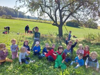Nach der Arbeit stärken wir uns mit einer leckeren Vesper, sangen noch einige Apfellieder/Fingerspiele und spielten und tobten im Sonnenschein auf der Wiese. Am Mittag ging es dann wieder zurück in den Wald zur Hütte, an der die müden, aber zufriedenen Kinder von ihren Eltern abgeholt wurden. Das nächste Highlight wartete schon am darauffolgenden Tag auf uns. Mit einer riesigen Apfelsaftpresse pressen wir alle gemeinsam aus unseren gesammelten Äpfeln leckeren eigenen Apfelsaft!