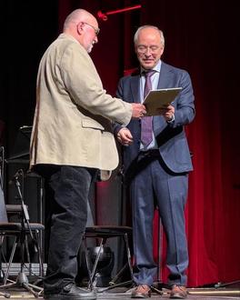 Alfred Haas erhielt eine Ehrung für sein herausragendes ehrenamtliches Engagement. Als Kirchenpfleger und Kirchenverwalter hat er sich maßgeblich für die Pflege und den Erhalt der Weißenhorner Kirchen eingesetzt. Auch als Mitglied im Aufsichtsrat der Wohnungsgesellschaft Weißenhorn mbH und in verschiedenen Funktionen innerhalb des Stadtrats (1978-2014) hat er stets Verantwortung übernommen. Besonders hervorgehoben wurde sein langjähriges Engagement im Amt des 2. und 3. Bürgermeisters. Bürgermeister Dr. Fendt sprach ihm für seine Verdienste um die Stadt und das Ehrenamt großen Dank aus.