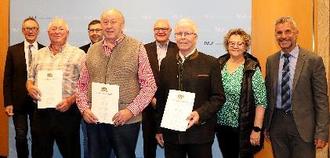 Freuen sich über die Ehrung (von links): Peter Lauber, Rupert Hörmann, Bürgermeister Markus Wöhrle (Markt Buch), Kurt Häußler, 2. Bürgermeister Johannes Stingl (Stadt Neu-Ulm), Erhard Knaus, 3. Bürgermeisterin Jutta Kempter (Stadt Weißenhorn) und stellvertretender Landrat Erich Winkler.