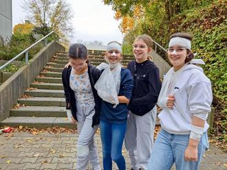 Passend zur Jahreszeit entstanden hierbei auch viele schöne Mumien. Die Schüler*innen legten verschiedenste Verbände an, übten die stabile Seitenlage und lernten sogar Herzdruckmassage, Beatmung und den Umgang mit dem Defibrillator. Dabei herrschte stets eine gute Mischung aus Spaß und nötiger Ernsthaftigkeit.