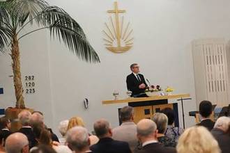 Am Abend des 31. Oktober 2024 erlebte die Gemeinde Illertissen, gemeinsam mit den Gemeinden Babenhausen, Krumbach und Vöhringen einen Gottesdienst durch Apostel Volker Keck in der Kirche in Illertissen. Das Bibelwort zur Einleitung des Gottesdienstes ist in Johannes 14, 1 zu finden: „Euer Herz erschrecke nicht! Glaubt an Gott und glaubt an mich!“ Nach der Einstimmung auf die Predigt durch das Chorlied „Wer unter dem Schirm“ (Chorbuch 191) stieg der Apostel direkt in die dortige Aussage „Meine Zuversicht und meine Burg, mein Gott, auf den ich hoffe“ ein und unterstrich: „Er ist die Hoffnung der Gläubigen!“ Zum Kontext des Bibelverses zeigte er auf, dieses sei aus den