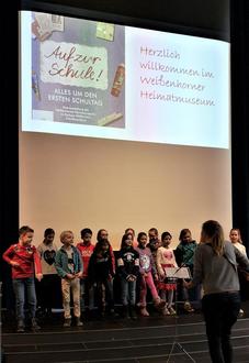Am Donnerstag, 8. November, durfte das Heimatmuseum beim Seniorennachmittag der Katholischen Kirche im Claretiner-Kolleg zu Gast sein. Im Beisein von Pfarrer Lothar Hartman und rund 40 Interessierten, erzählten Stefanie Warkus und Matthias Kunze von der gerade zu Ende gegangenen Ausstellung „Auf zur Schule! Alles um den ersten Schultag“. Mit Hilfe einer Power Point-Präsentation vermittelten Sie anschauliche Eindrücke von der Ausstellung und den vielen Relikten aus längst vergangenen Schultagen, die zahlreiche Erinnerungen beim Publikum wachriefen. Die Erzählstunde wurde heiter umrahmt vom Kinderchor der Grundschule Süd unter der Leitung von Mary Sukale. Am folgenden Tag wurde die Veranstaltung im Seniorenheim der Heilig Geist Spitalstiftung Günzburg wiederholt, wo sie ebenfalls regen Anklang fand. Alle Beteiligten waren sich einige, dass dies eine schöne Bereicherung für die Seniorinnen und Senioren war, und das Heimatmuseum gern wieder einmal zu Besuch kommen dürfe, zumal in der Zeit, da unser Haus wegen Umbau geschlossen ist.