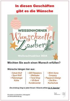 Sport Wolf, Schuh Wolf, Platzmetzger Kühle, DER Reisebüro, Weltladen, Trend Shop, VR-Bank Kundencenter, Wirth Home Company, Pepperoni Design und Die Bine Kochschule. Dort hängen die anonymen Wünsche (wer sich etwas gewünscht hat, bleibt verborgen und ist nur der Stadt bekannt). Aus und können mitgenommen werden. Die Wunscherfüller haben dann Zeit bis Mittwoch, 18. Dezember, um den erfüllten Wunsch, nett verpackt, im Rathaus abzugeben. Das Team der Stadtverwaltung wird die Wünsche dann vor Weihnachten zustellen und den Weihnachtsmann ein wenig unterstützen.