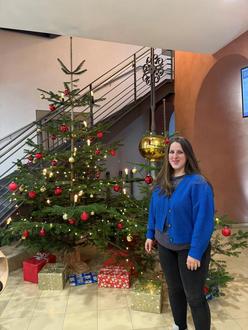 Unsere Auszubildende Eva Schenk vor dem von ihr geschmückten Christbaum im Rathaus.