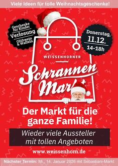 Dieser Markttermin steht unter dem Motto 'Weihnachten' - es gibt Glühwein und Leckereien für die Großen und bei jedem Einkauf ein Los. Für die Kleinen verteilt zwischen 15 und 18 Uhr ein Weißenhorner Weihnachts-Engel kleine, süße Geschenke. Gegen 17.30 Uhr werden dann aus den Losen des Tages die Gewinner einiger toller und sehr spezieller Preise gezogen, die es so sonst nirgendwo gibt.