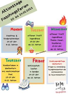 In den Faschingsferien noch nichts vor? Im und um das Jugendhaus finden Aktionstage statt. Melde dich noch bis zum 15.02.2023 an!